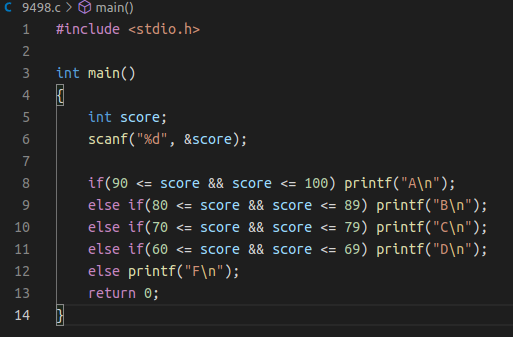 → if else ~ if else ~ 구문을 활용하여 성적의 범위를 설정해주고 해당하는 점수의 등급을 출력하는 프로그램이다.