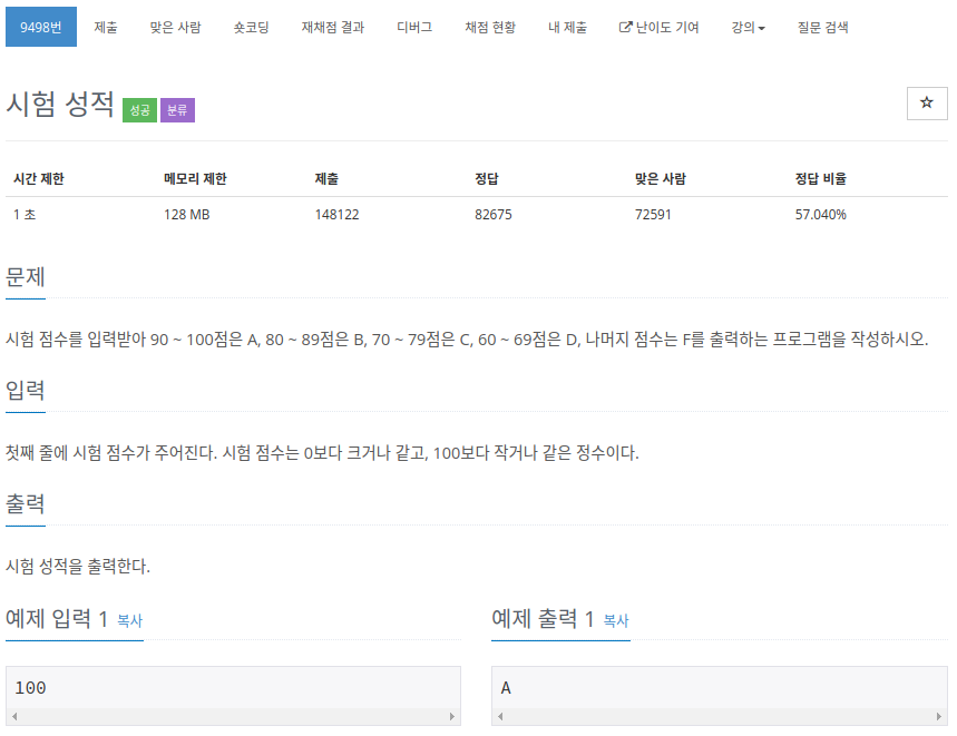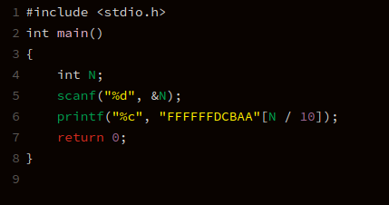 → 삼항연산과 아스키코드를 활용한 풀이이다. 삼항 연산은 위의 2번에서 설명했다. 아스키코드 부분을 설명하자면, 아스키코드에는 각 문자마다 고유의 십진수를 가지고 있는데 문자 A는 97번이고 Z는 122번이다. 즉 A ~ Z까지 97 ~ 122번, 문자 A부터 각 문자 순서대로 1씩 증가하는 번호를 갖고 있다. 위 코드는 그 특징을 활용한 것이다. 등급을 나누는 범위가 10으로 나눈 몫으로 생각하면 아스키코드의 번호와 같이 1 차이를 갖으므로, 그 차이를 문자 A에 더해 줌으로써 등급을 구분해서 출력할 수 있는 것이다.