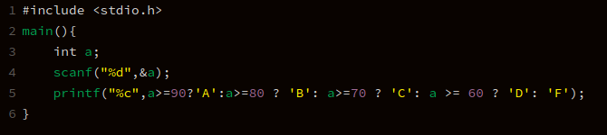 → 삼항연산을 활용한 풀이이다. 삼항 연산의 기본 형태는 " 조건식? (참일 때의 값) : (거짓일 때의 값) "이다. 위의 코드와 같이 거짓일 때의 값에 삼항 연산을 넣음으로써 삼항 연산을 중복으로 활용하였다.