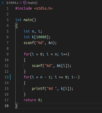 - 문제 설명 : 배열에 수를 입력 받고, 입력 받은 수의 순서를 거꾸로 하여 출력하라.