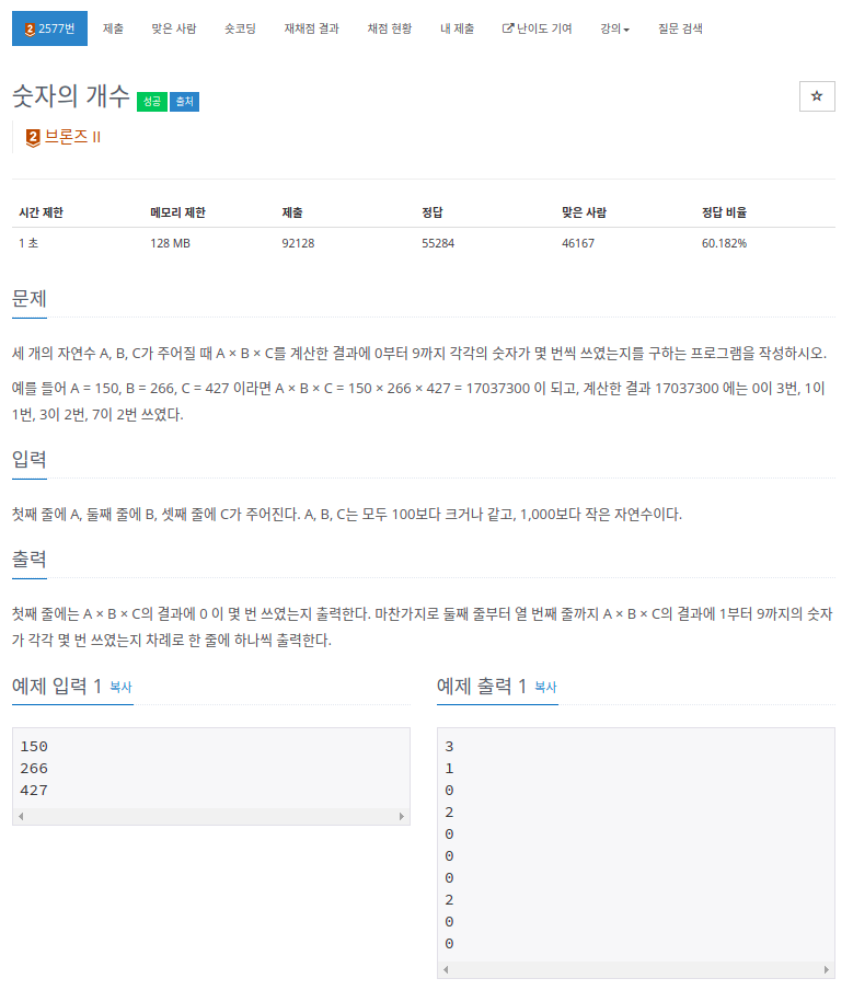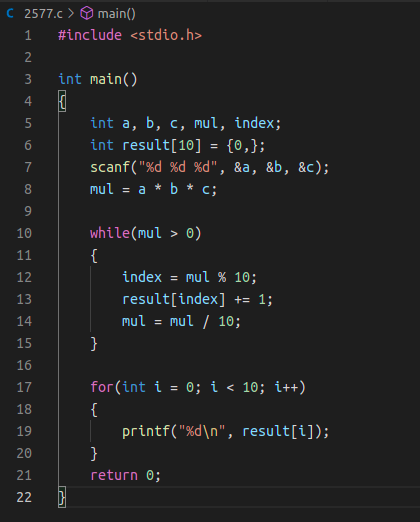 - 출력란을 보면 0 ~ 9를 순서대로 개행을 하여 곱셈해서 만든 수에 몇 개씩 존재하는지 나타내라 했다. 0 ~ 9를 순서대로 나타내는 것이 배열의 index 순서와 같다는 것에 착안하여, 배열의 0 index에는 0의 개수를, 1 index에는 1의 개수를 저장하는 방법으로 9번까지 개수를 저장하고 출력하면 된다.