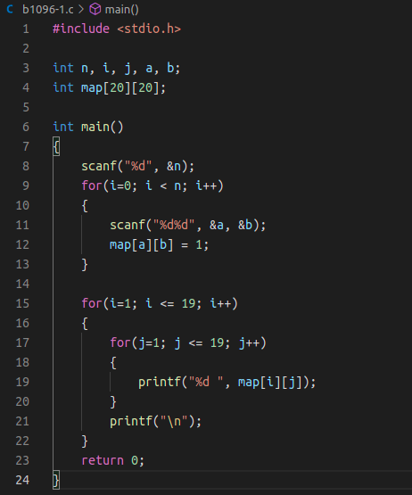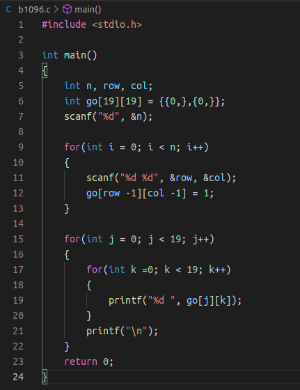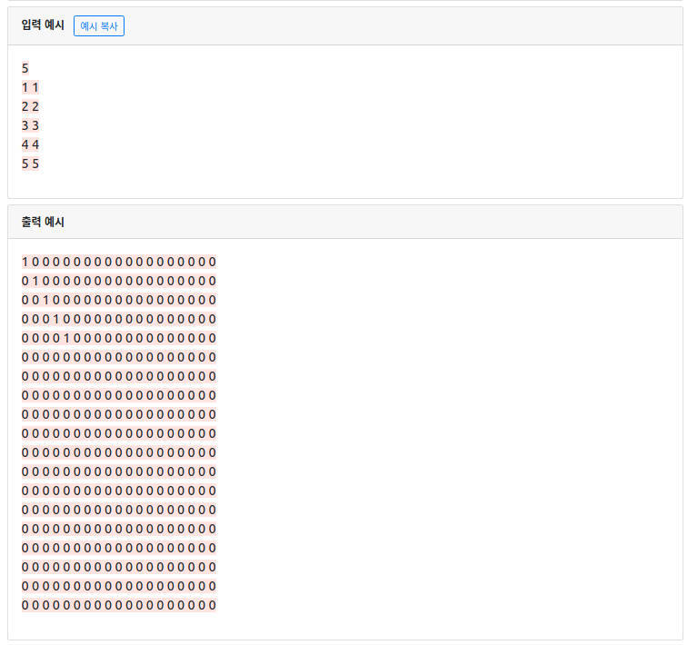 - 출력 : 흰 돌이 올려진 바둑판의 상황을 출력한다. 흰 돌이 있는 위치는 1, 없는 곳은 0으로 출력한다.