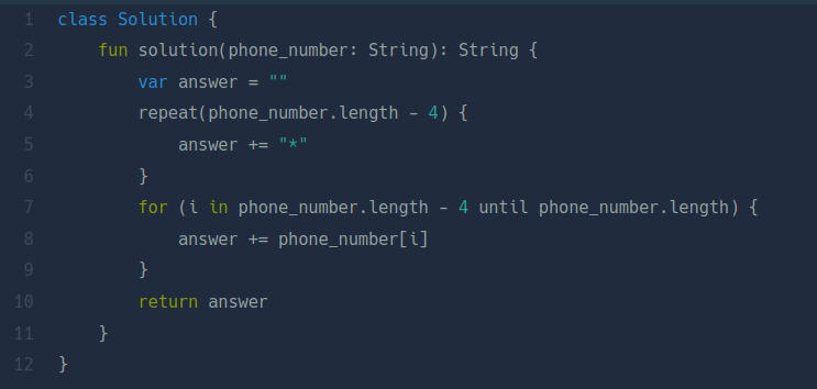 - 입력받는 String의 길이에서 4를 빼면 ' * ' 로 바꾸어야 문자의 개수이다. 그 개수만큼 ' * '를 answer 변수에 넣어준다.